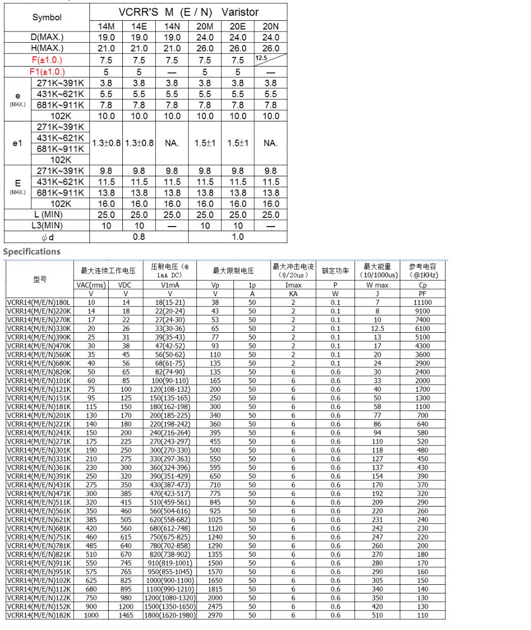 ?壓敏電壓從(18V-1800V) ?具有UL ,TUV認證,符合RoHS,Reach標準,無鉛 ?專利的集成熱保護裝置 - ?旨在促進符合UL1449第3版SPD產品 ?和促進符合IEC62368 ,IEC61643-331產品 ?高峰值浪涌電流額定值高達10kA ?波可焊 ?標準引線形式和間距選項 ?低泄漏 ?-55°C至+ 85°C的工作溫度范圍