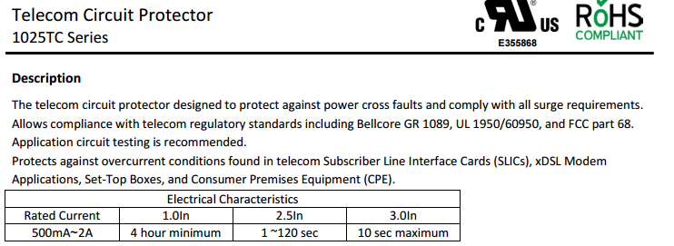 Protects against overcurrent conditions found in telecom Subscriber Line Interface Cards (SLICs), xDSL Modem Applications, Set-Top Boxes, and Consumer Premises Equipment (CPE).