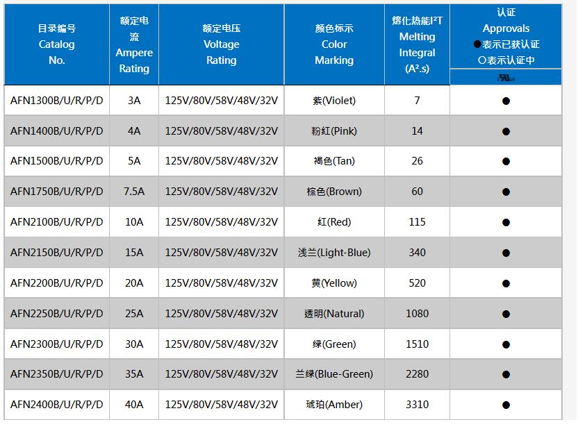 關鍵字:AFN 32V 58V 80V 汽車保險絲