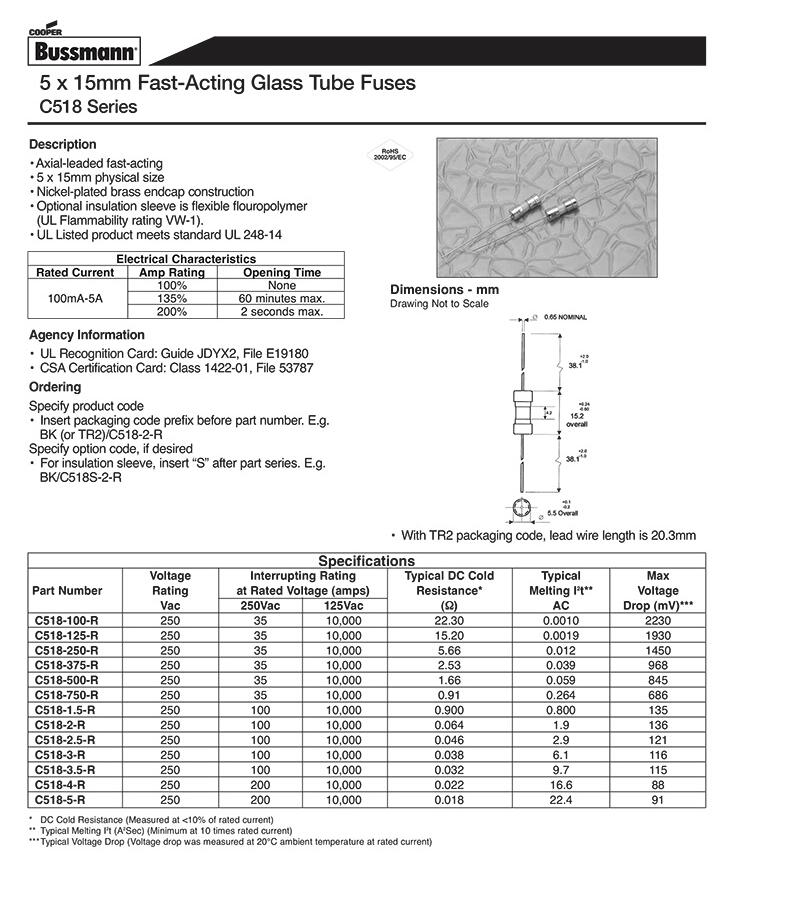 庫柏玻璃管保險絲 C518 250V 5*15灌沙保險絲