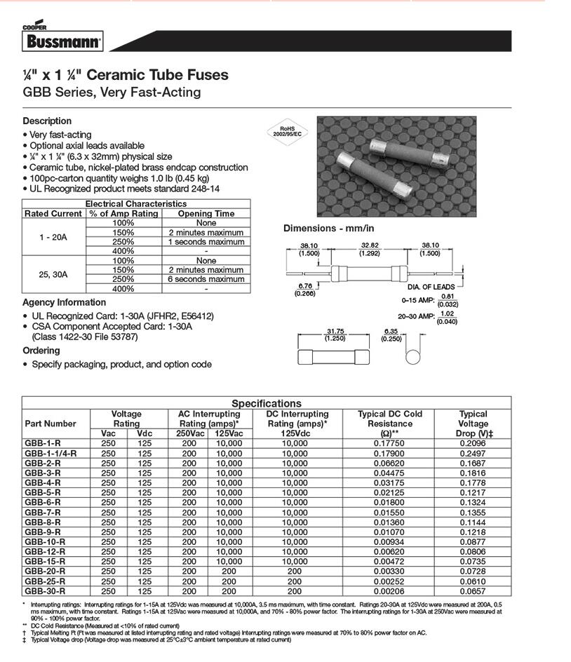 GBB 綠色陶瓷管 250Vac 電流陶瓷保險絲