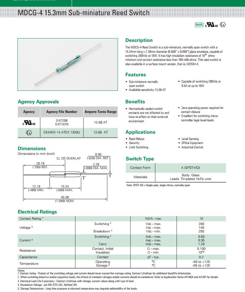 關鍵字:MDCG-4 系列 - 15.3mm磁簧開關|HAMLIN|干簧管