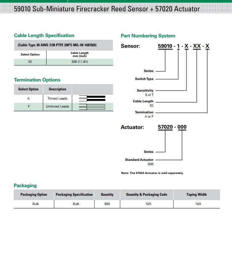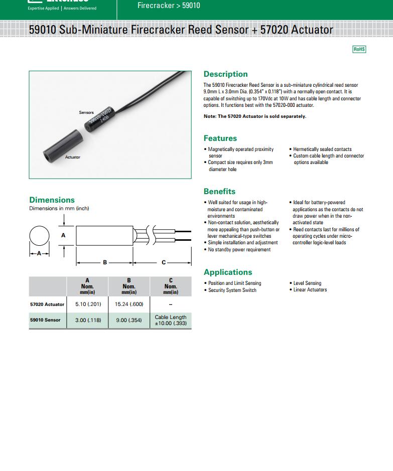 關鍵字:59010 系列 - 超小型Firecracker磁簧傳感器