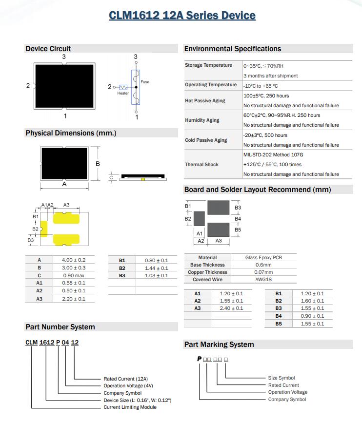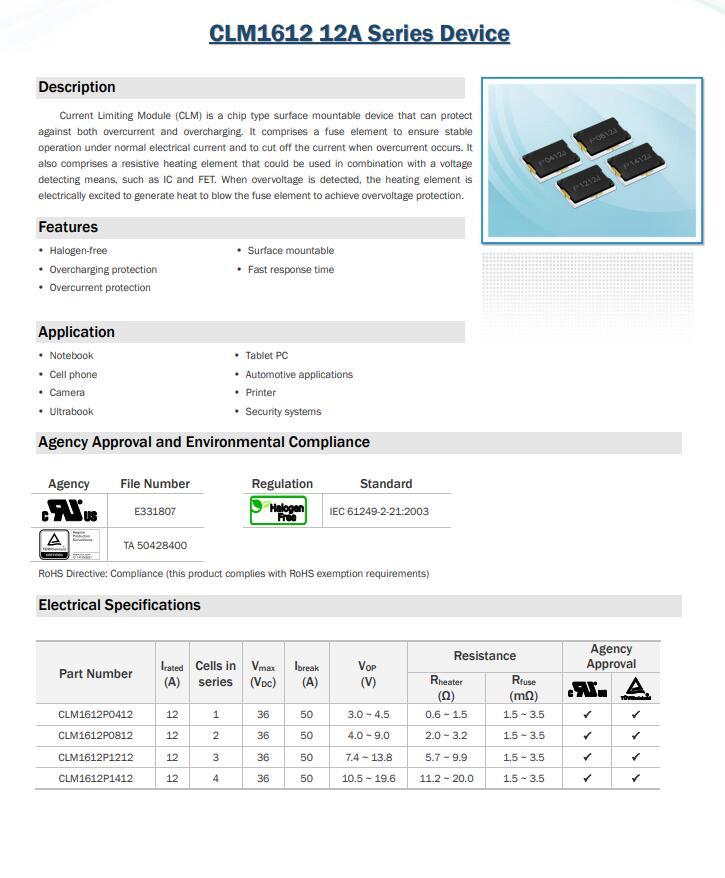 關鍵字:CLM1612 12A Series Device 三端保險絲